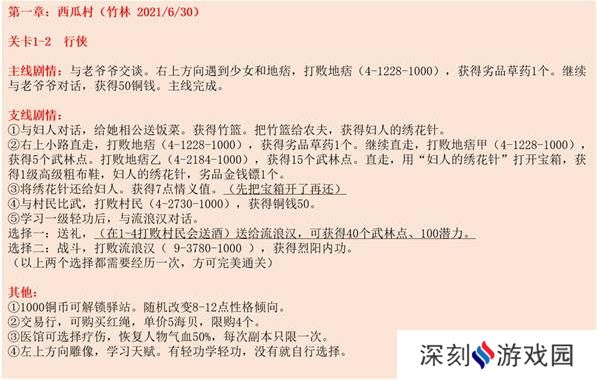 第二关 行侠(本关需要两次才能完美通关,第一次直接打败流浪汉,第二次去带1-4拿了酒再回来送给流浪汉。)提醒:1-2第一次不能完美通关,是因为流浪汉没送酒(已验证,将1-4的酒送给流浪汉,即为完美通关)。另外:1-2的绣花针,可以先打完地痞,开了宝箱,再还给妇人。不然就只能重置才能完美了。(文字版,下划线部分为后续完善)