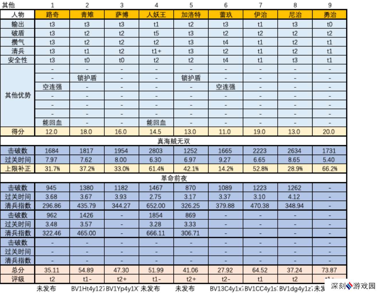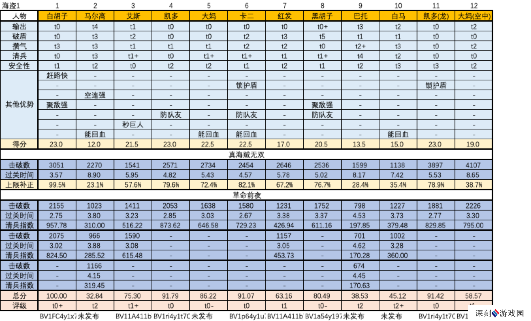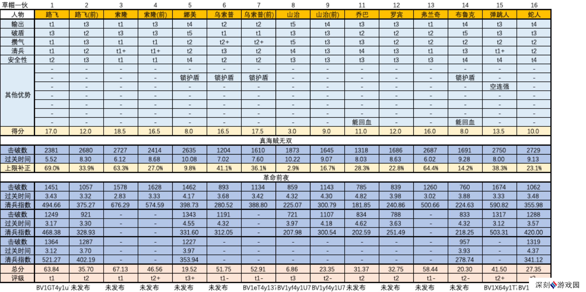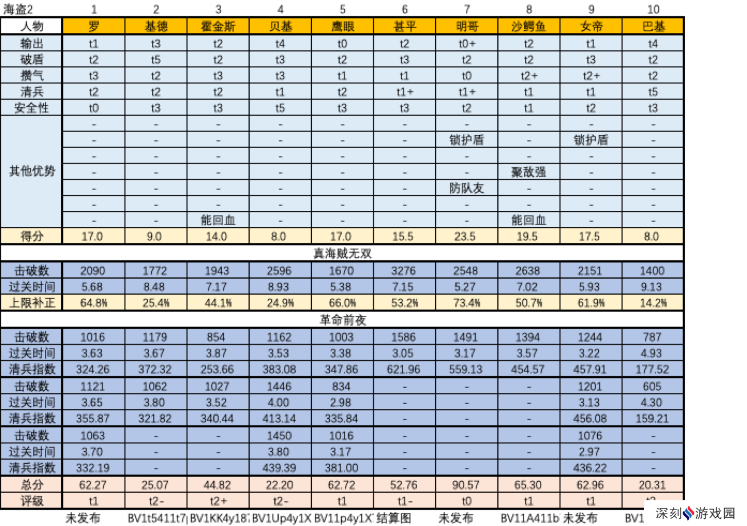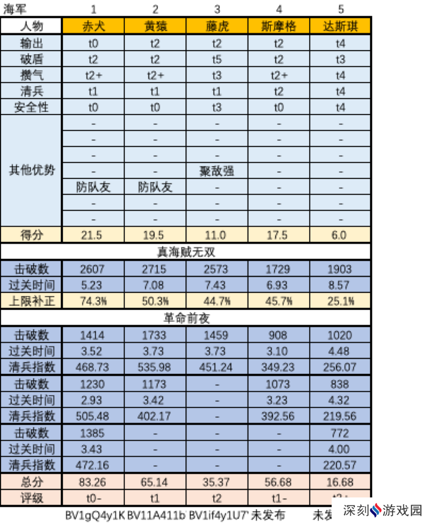 上述人物评级是综合了单项评价(输出、破盾、攒气、清兵、安全性等)和“真海贼无双”的战绩后给出的。
