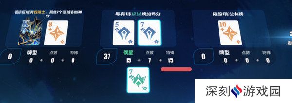 ②.场地额外分,触发场地效果额外加分。如图:一张权杖牌额外+15
